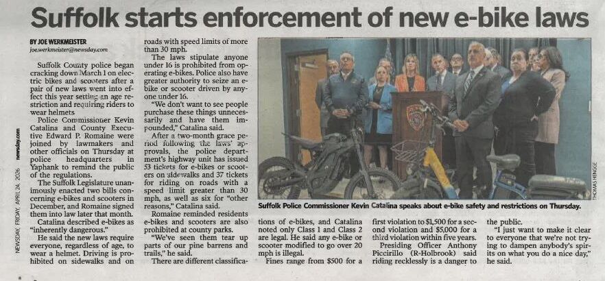 April 24, 2026Dear Parents and Guardians,I want to draw your attention to a pair of new laws that went into effect earlier this year regarding e-bikes. In case you missed it in Newsday today, pleas...